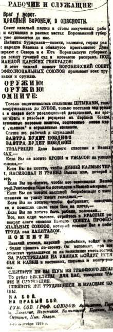 «Губернский комитет РКСМ опубликовал обращение ко всем комсомольцам и молодежи губернии: «Молодежь! Ты, которая шла в первых рядах революции, ты должна вынести еще одно испытание, ты должна помочь разбить Мамонтова с его ордою… Нельзя ждать, пока казацко-калмыцкая шашка или нагайка прогуляется по твоей спине… Красная пролетарская молодежь, на борьбу! У кого не трусливое сердце, сильный дух и крепкие руки – беритесь за винтовки! Девушки-пролетарки, помогите и вы по мере сил! Вдохните энергию в красных бойцов, ухаживайте за ранеными! Кто честен и смел, пусть оружие берет. Шептунам и трусам нет пощады! К спокойствию! К борьбе! К победе!».