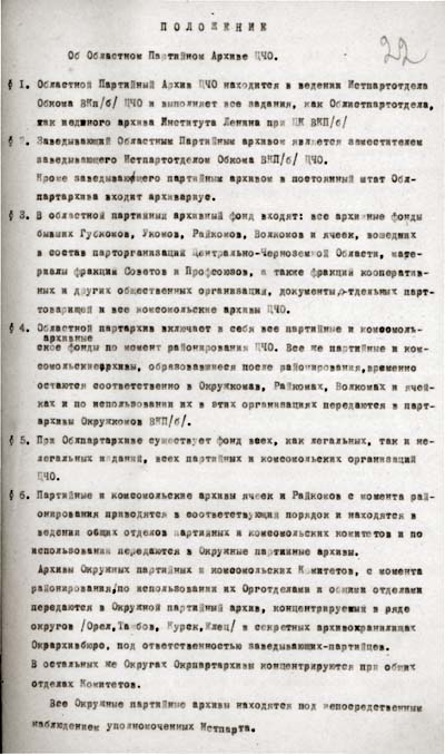 25 февраля 1929 года бюро обкома ВКП(б) Центрально-Чернозёмной области утвердило план работы истпарта на 1929 год, где в параграфе 4 было указано: «создать областной партийный и комсомольский архив и принять меры к стягиванию в него архивных материалов укомов, райкомов, волкомов и ячеек ВКП(б)».