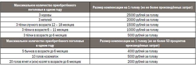 Количество приобретённого поголовья в одном году и размер компенсации на одну голову представлены в таблице.