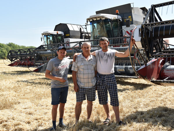 Комбайнеры (справа налево) Григорий Гвозденко, Сергей Поволоцкий и водитель Александр Новгородцев.