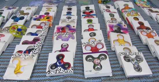 Тоже подходим к прилавку с этими новомодными игрушками – узнать, что по чём. Самые дешёвые – пластиковые – вертушки здесь можно купить за 150 рублей, но их, как нас заверила продавец, при активном пользовании хватит максимум на неделю. Убедила, что если взять металлический спиннер за 450 рублей, то прослужит он намного больше.