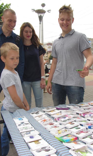 К торговой точке подходит компания молодых людей. Студент Леонид Артёмов деловито берёт в руки одну из крутилок и ловко начинает вертеть её в своих пальцах.