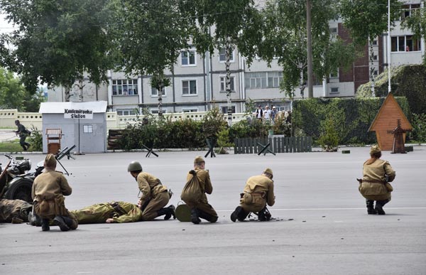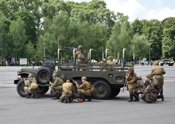 Далее всех прибывших на праздник ждало красочное военизированное шоу. На центральном плацу дивизии военнослужащие продемонстрировали реконструкцию боя при освобождении Кантемировки в 1942 году. При участии группы реконструкторов было разыграно настоящее сражение. В танковой атаке «воевали» даже музейные экспонаты: трофейная бронетехника и Т-34/76.