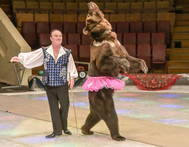Словно из той же прекрасной детской поры пришли и пудели дрессировщицы Натальи Борисовой, и кошки Лилии Киселевской из номера «Дама Кэт». Ну и, конечно, медведи Народного артиста России Гранта Ибрагимова. Ещё в послевоенную пору на базарных площадях Воронежской области можно было увидеть цыган, водивших на цепи медведей. Косолапые пускались в пляс, выделывали всякие забавные штучки… Вот на основе того давнего балаганного представления, как мне показалось, и поставлен аттракцион Гранта Ибрагимова. Только задачи дрессировщик ставит перед своими четвероногими подопечными (а работают они, кстати, только на задних лапах) куда более сложные.