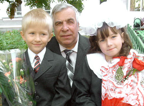 Купили интерактивные доски, на подходе оборудование для лингафонного кабинета. На снимке директор школы Иван Никитович Маликов и первоклассники Саша Кузнецов и Вика Денисова.