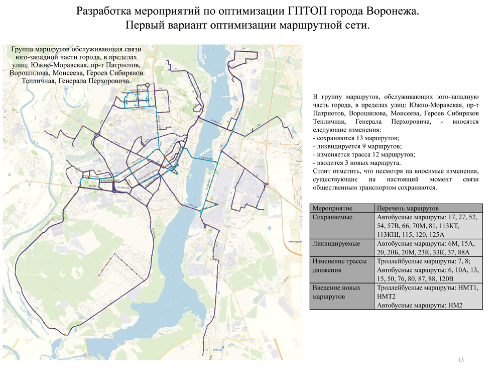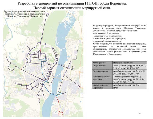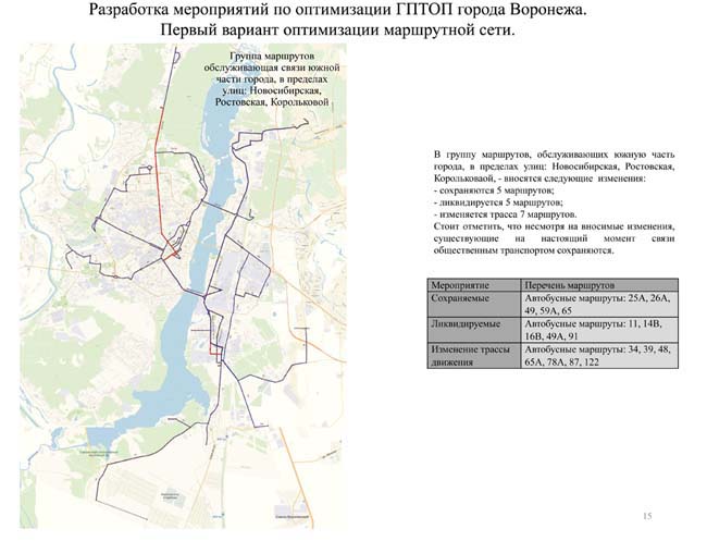 Открытую презентацию проекта провели представители разработчика – ФАУ «РосдорНИИ». Владимир Пащенко и Дмитрий Порошин озвучили данные анализа нынешней маршрутной сети Воронежа и предложения по изменению ситуации. Основные недостатки действующей сети –перенасыщенность (дублирование маршрутов достигает 50%), отсутствие выделенных полос для движения пассажирского транспорта, большое количество подвижного состава малой вместительности, изъяны в транспортном обслуживании новых микрорайонов.