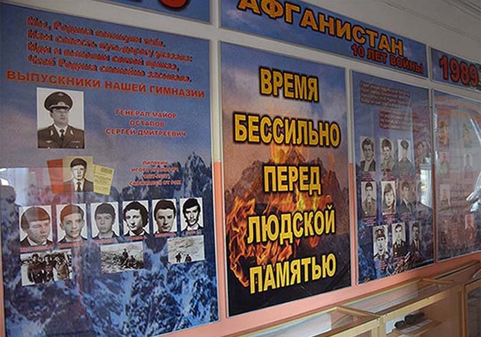 Экспозицию продолжают фотографии воинов- интернационалистов. Среди них – выпускник школы 1969 года генерал-майор Сергей Дмитриевич Астапов. Рядом — фото выпускника 1971 года, члена школьного штаба «Поиск», летчика-испытателя Евгения Захарова. Он отвёл неисправный самолет от большого села, а сам погиб.