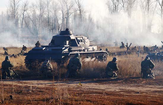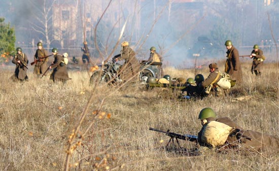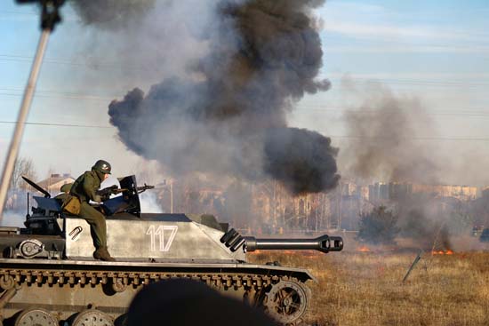 – Это дом моей бабушки, – говорит Виталий Владимирович. – Вот видите – она в тёмном платке читает похоронку на сына, погибшего под Сталинградом. А этот крепкий мужчина, подкидывающий ребёнка, – мой дядя-танкист, он участвовал в Прохоровском сражении. Тот, что играет на гармошке, тоже мой дядя. А девчушка на лавочке – моя будущая мама. Ей здесь тринадцать лет. Вот собачка на привязи бегает. А вот птички летают. Жизнь продолжается. И всё в ней есть: радости, горести, надежды…