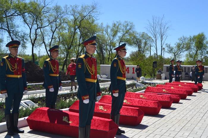 Церемония захоронения останков бойцов РККА проводилась под оружейные залпы почетного караула и звуки военного оркестра. К братской могиле возложили венки и цветы. могиле. Завершилась церемония минутой молчания и торжественным прохождением роты почетного караула.