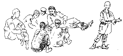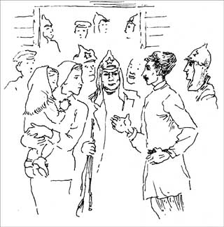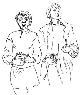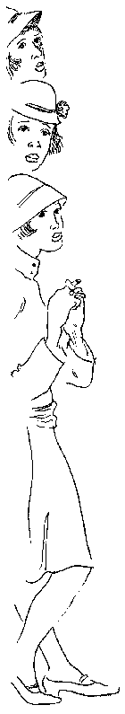 Позднее выходят женщины в ярких костюмах, чересчур напудренные, с налепленной на губах краской.